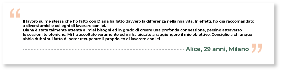 Il lavoro su me stessa che ho fatto con Diana ha fatto davvero la differenza nella mia vita. In effetti, ho già raccomandato a diversi amici e colleghi di lavorare con lei. Diana è stata talmente attenta ai miei bisogni ed in grado di creare una profonda connessione, persino attraverso le sessioni telefoniche. Mi ha ascoltato veramente ed mi ha aiutato a raggiungere il mio obiettivo. Consiglio a chiunque abbia dubbi sul fatto di poter recuperare il proprio ex di lavorare con lei.