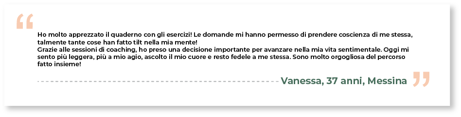 Ho molto apprezzato il quaderno con gli esercizi! Le domande mi hanno permesso di prendere coscienza di me stessa, talmente tante cose han fatto tilt nella mia mente! Grazie alle sessioni di coaching, ho preso una decisione importante per avanzare nella mia vita sentimentale. Oggi mi sento più leggera, più a mio agio, ascolto il mio cuore e resto fedele a me stessa. Sono molto orgogliosa del percorso fatto insieme!