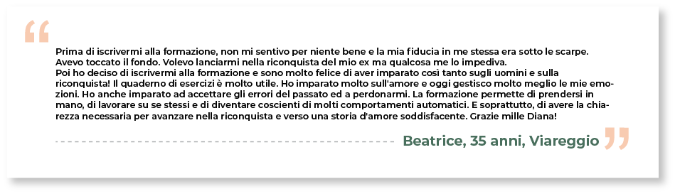 Prima di iscrivermi alla formazione, non mi sentivo per niente bene e la mia fiducia in me stessa era sotto le scarpe. Avevo toccato il fondo. Volevo lanciarmi nella riconquista del mio ex ma qualcosa me lo impediva. Poi ho deciso di iscrivermi alla formazione e sono molto felice di aver imparato così tanto sugli uomini e sulla riconquista! Il quaderno di esercizi è molto utile. Ho imparato molto sull'amore e oggi gestisco molto meglio le mie emozioni. Ho anche imparato ad accettare gli errori del passato ed a perdonarmi. La formazione permette di prendersi in mano, di lavorare su se stessi e di diventare coscienti di molti comportamenti automatici. E soprattutto, di avere la chiarezza necessaria per avanzare nella riconquista e verso una storia d'amore soddisfacente. Grazie mille Diana!